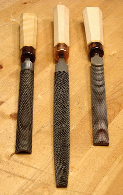 But today I could relax in the shop, and I used my time to make handles for three new tools my wonderful wife gave me for Christmas: two Japanese milled-tooth files and a Nicholson #49 pattern makers rasp. Yes!